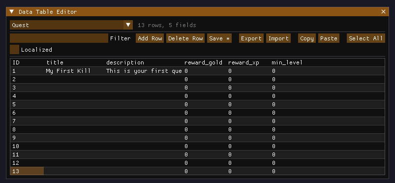 As it turns out, really good! I quickly fleshed this out with some quality-of-life features such as importing/exporting, localization fallback, filtering, etc. It works out really nicely, and there's no faster way to edit game data than doing it directly in-game. The changes are effective immediately, helping keep a tight iteration loop.