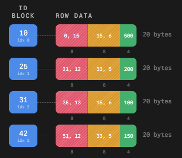 Looking up a row in our new format is easy and fast, providing you know the index, but we probably want to look up a row by an ID in most cases. To solve this, we add another block called an "ID block".