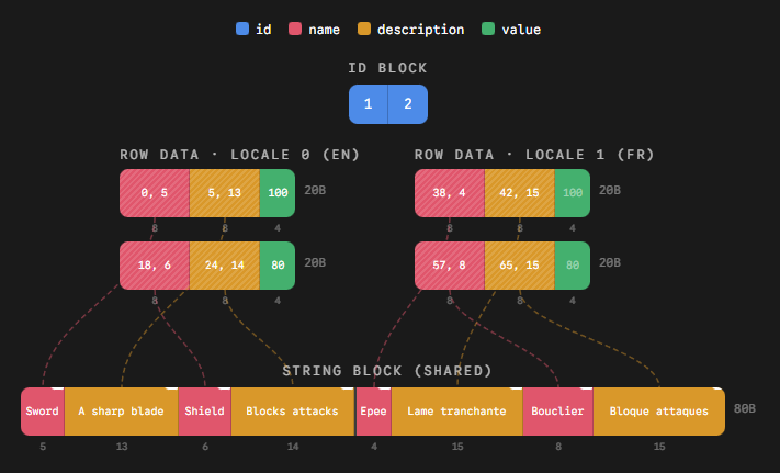 Another optimization we can sprinkle in here is that we can de-duplicate strings inside the string block. If the string "Wizard" appears 200 times in a table, we only need to store it once in the string block and all the rows can reference it.