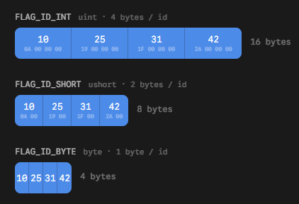 The first is simple. In the ID block, we're storing each ID as a uint which is 4 bytes, which means we can have over 4 billion entries. Realistically? We're not hitting that limit. If we stored it as short instead, we could have up to 65,535 rows, more reasonable. If we stored it as a byte we could have up to 255 rows.