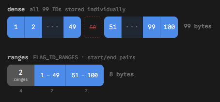 Cool, what about if I now delete row 50? We have a hole in the middle of the table, and we can't do a sparse ID block. For that, we revert to using a HashMap at runtime for the lookups, but we can still save some bytes in the ID block by ranging.