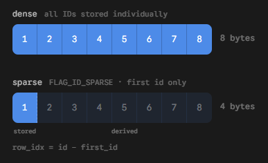 The engine will see this flag, it already knows how many rows are stored in a table, so now it knows every row is n + start_id. Even better, since we know the ID block is sequential with no gaps, we can throw the HashMap in the bin and just do a O(1) lookup directly with row_idx = id - sparse_first_id. Best-case scenario!